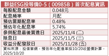 群益ESG投等債0-5(00985B)即將首次配息囉!官網公布本次預估每股配發0.048元。以今(20)日收盤價10.04元來推算,單次配息率近0.48%,年化配息率約5.74%。