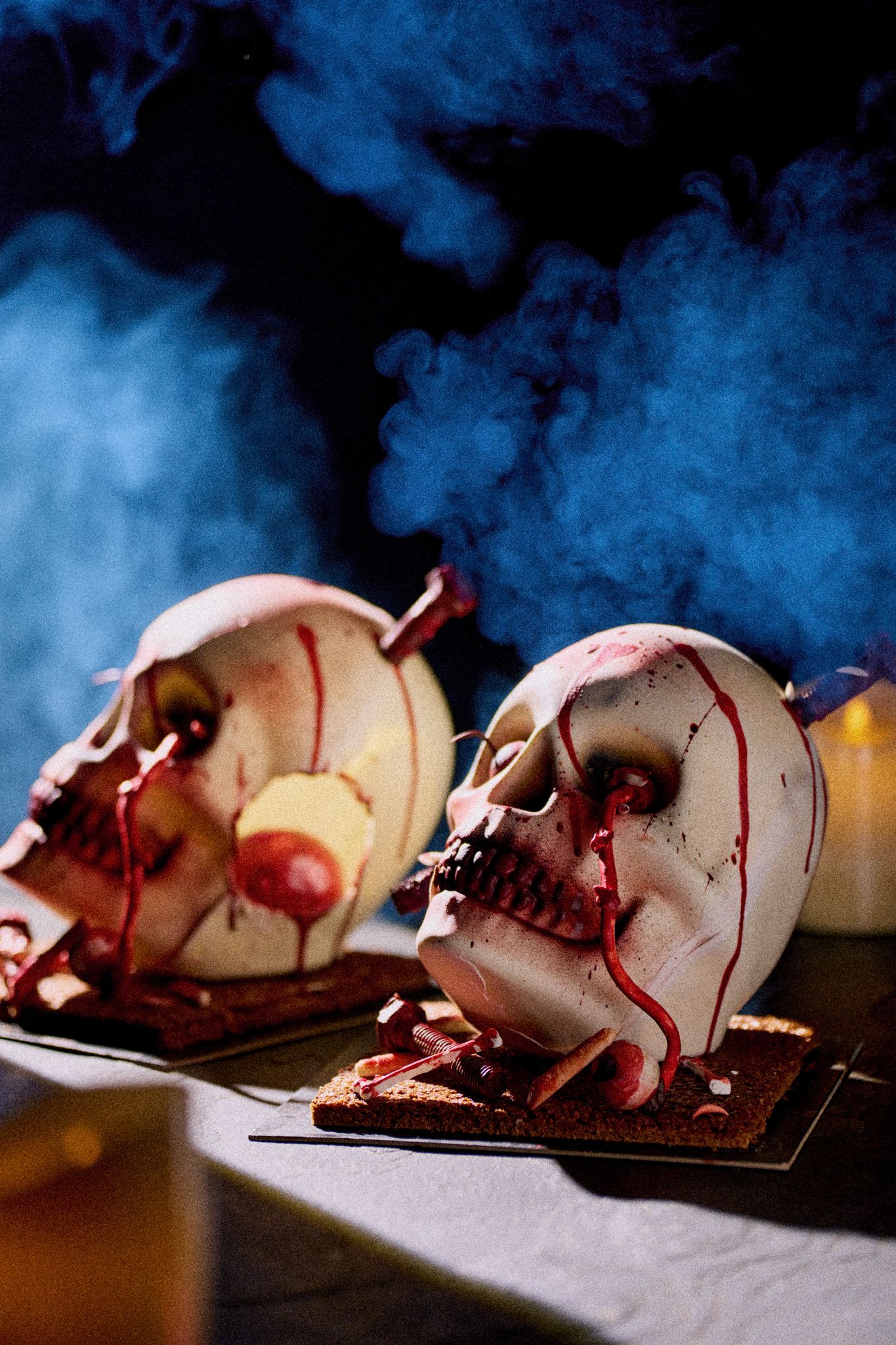 圖說:台南晶英酒店萬聖節限定「骷髏詛咒」蛋糕,以白巧克力打造立體頭骨造型,血紅色巧克力象徵詛咒靈魂,驚悚逼真宛如電影場景 (圖片來源/晶英酒店提供)
