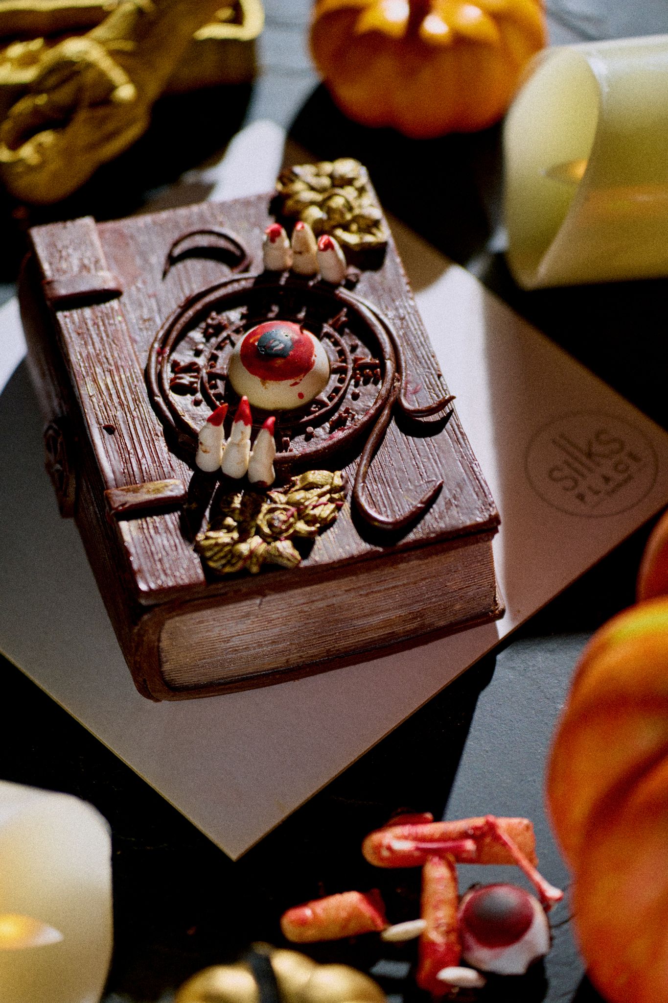 圖說:造型蛋糕「惡靈之書」以沙哈巧克力蛋糕融合榛果及巴納脆片,精緻雕塑如古老魔法書般神秘詭譎 (圖片來源/晶英酒店提供)