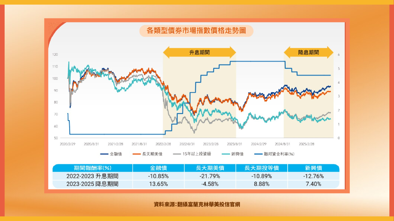 根據ICE美銀指數資料,在2023停止升息至2025年降息期間,ICEBofA10年期以上美元金融債指數的報酬率達13.65%,優於長天期美債的-4.58%、長天期投資級債的8.88%及新興市場債的7.40%,展現賺取資本利得的潛力。