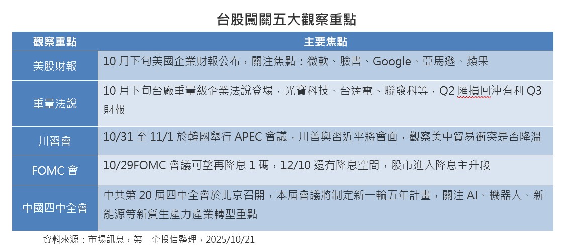 張正中指出,10月底之前要觀察,美國大型企業微軟、臉書、Google、亞馬遜,及蘋果等財報公布;政治面與政策面則留意10月底於韓國登場的川習會,是否有助緩和美中貿易衝突;聯準會是否再次降息,引導股市進入降息主升段;還有中國的四中全會,新一輪經濟政策受惠產業帶來後市期待。
