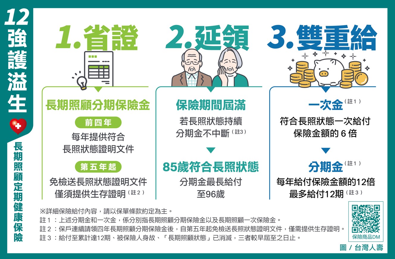 為提升國人長照風險防禦力,台灣人壽12強護溢生長期照顧定期健康保險(簡稱:12強護溢生)全新上市,以「省證、延領、雙重領」三大特色,助攻民眾預備穩定長照金流。