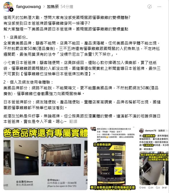 網友在脆文指出,首家上架的加熱菸產品被要求「顧客不能問、店員不能講、品牌不能露」,違者最高可罰50萬元,且常有反菸團體蒐證檢舉。但另一家產品開賣可公開展示,還能由店員介紹、掃碼入會。網友直言這是選擇性行政。