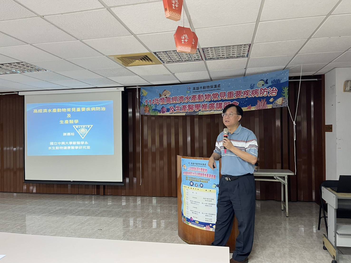 ↑圖說:中興大學獸醫學院副教授謝嘉裕針對高經濟水產動物常見重要疾病、飼養管理及疾病防治等提出精闢報告及探討。(圖片來源:高雄市農業局提供)