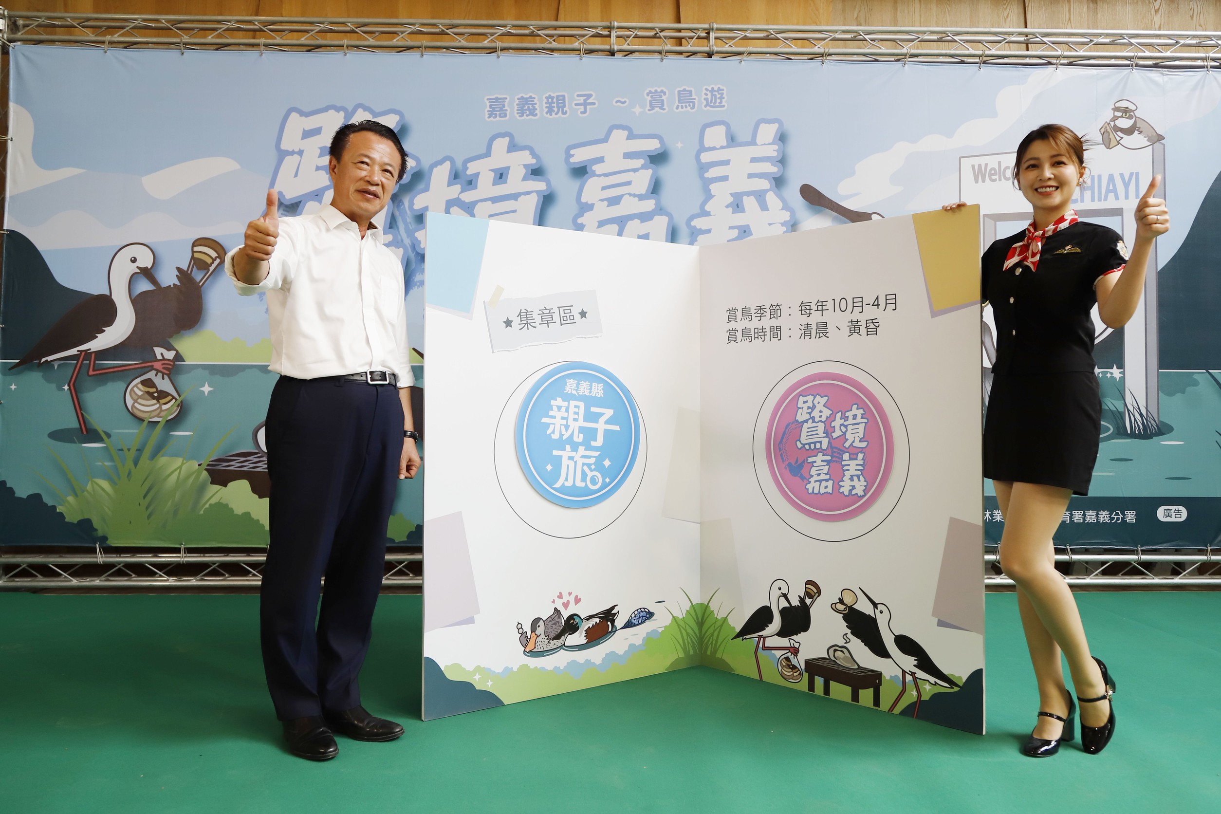 在記者會上,縣長翁章梁化身「機長」,與藝人謝京穎扮演的「空服員」一起帶領現場貴賓搶先體驗「鷺境嘉義」的樂趣。翁章梁笑說,嘉義擁有山海交織的地景,秋冬更是候鳥的天堂,透過導覽解說、親子體驗與集章活動,讓大小朋友都能在遊玩中認識濕地生態的奧妙。