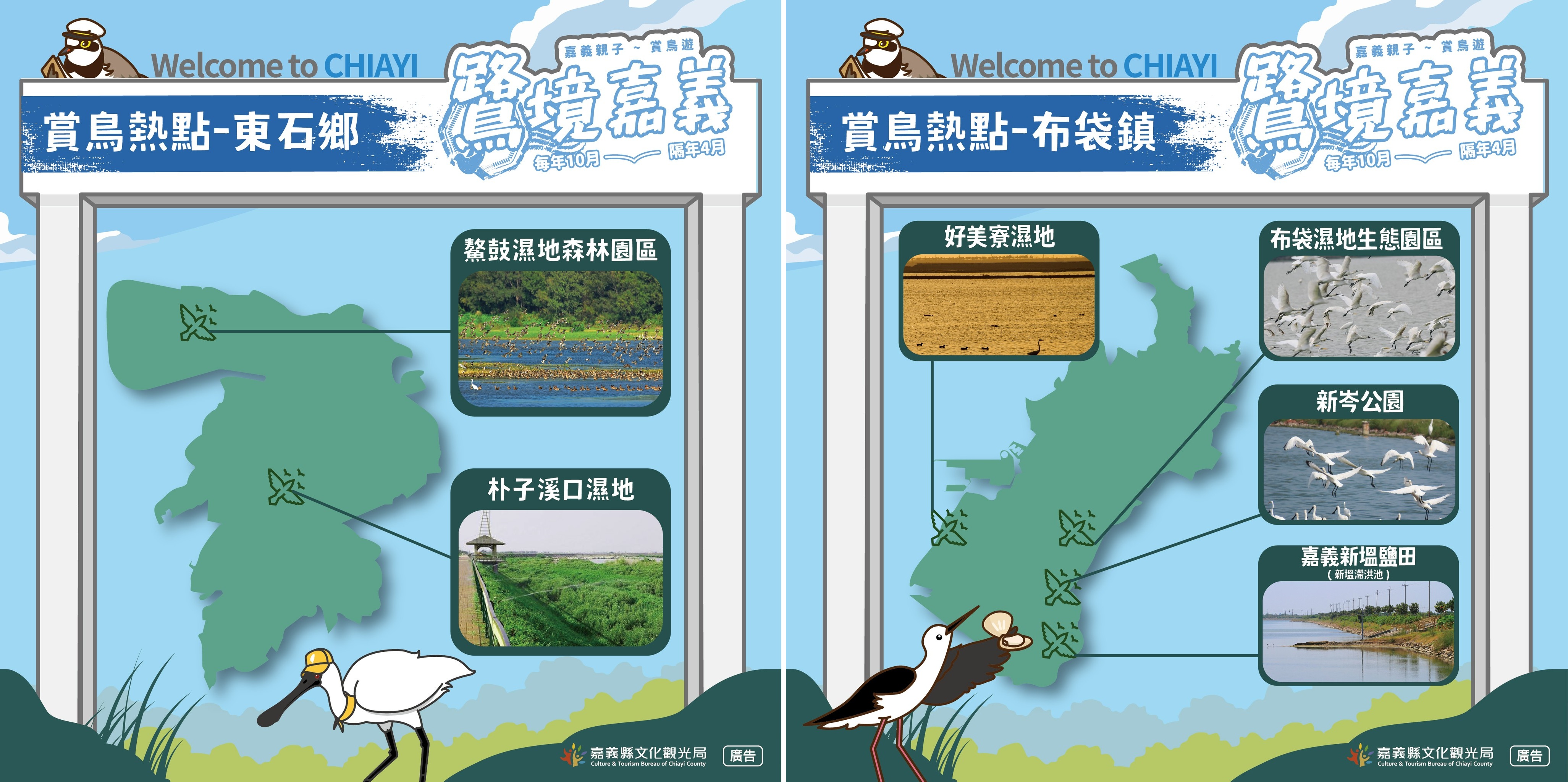 嘉義縣東石、布袋沿海一帶的六大賞鳥熱點,包括朴子溪口濕地、鰲鼓濕地森林園區、新岑公園、布袋濕地生態園區、好美寮濕地及新塭鹽田(新塭滯洪池),每年都吸引大批鳥迷前來拍攝「明星候鳥」——國際瀕危的黑面琵鷺、琵嘴鴨及高蹺鴴。翁章梁也現場分享牠們的可愛台語名稱:「烏面抐桮(黑面琵鷺)」及「躼跤仔(高蹺鴴)」,引來笑聲不斷。