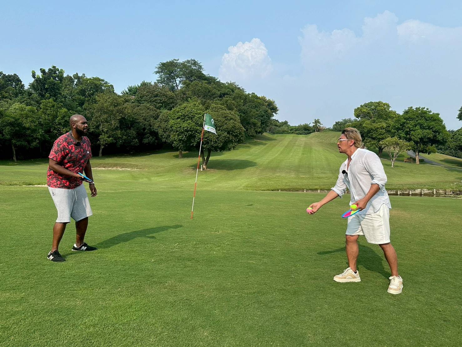 節目中,夢多與杜力展開一場爆笑的「果嶺挑戰日」。他們從9號果嶺玩起飛盤、抓尾巴、黏巴球等親子遊戲,勝負還決定交通方式——贏家搭乘電動車,輸家得徒步追趕,笑料不斷。兩人隨後在10號果嶺野餐賞鳥,近距離觀察園區多樣的生態樣貌,享受大自然的恬靜氛圍。