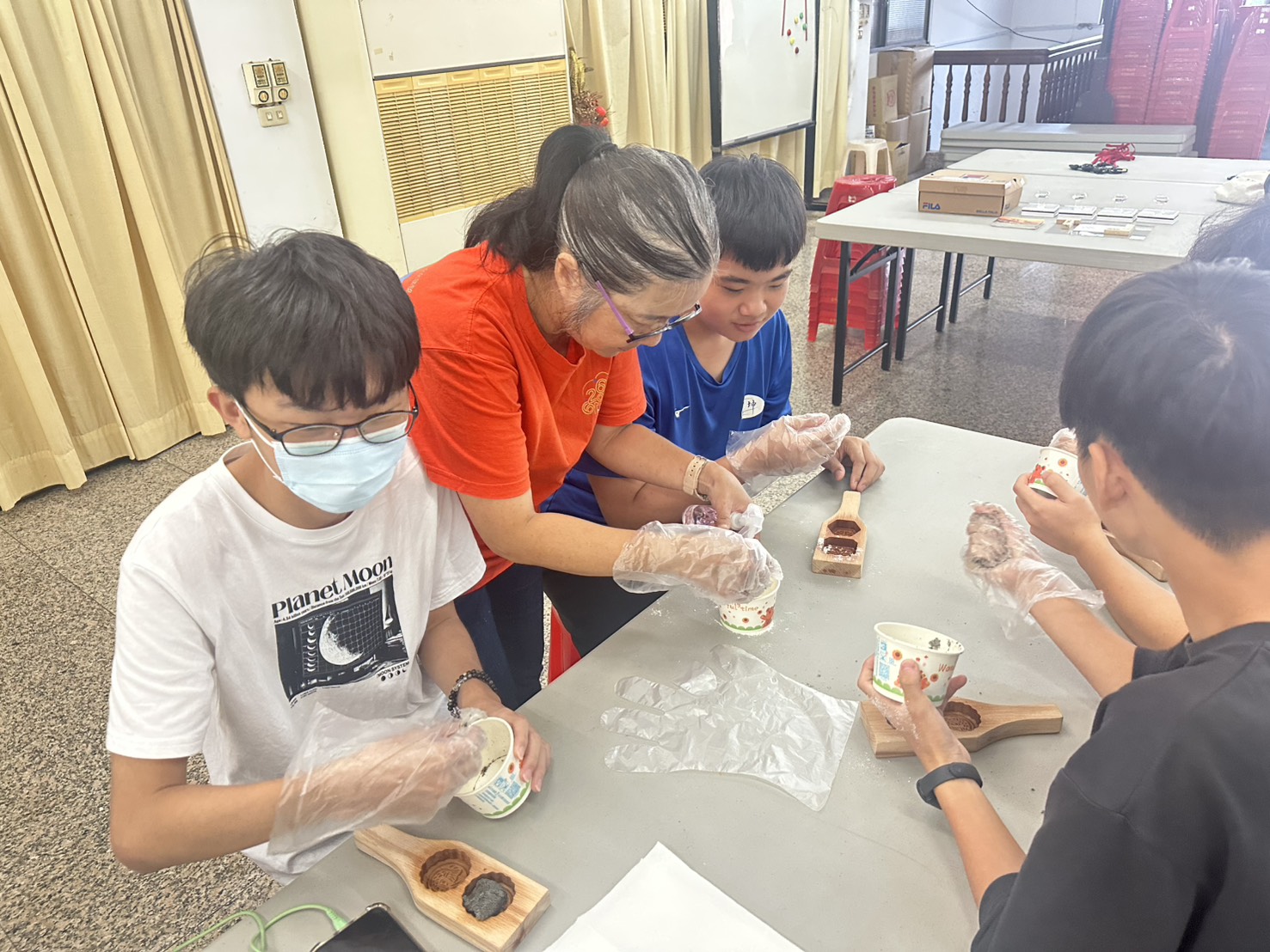 除了知識性的導覽,此行也安排具民俗生活感的「扣糕仔」體驗活動。學生於天后宮活動中心親手將米粉與水調和、裝入木製模具,再以手掌「扣、扣」兩聲,將糕仔完整敲出成形。短短幾分鐘的製作過程,讓許多學生驚呼「原來傳統點心製作這麼療癒」,也有人挑戰較大型的模具,現場笑聲不斷。