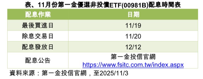 第一金優選非投債ETF(00981B)最新月配息出爐,初估配息0.069元,維持連3個月不變。此次除息交易日為11月20日,想參與配息的投資人,最晚要在19日買進且持有,即可在12月12日入帳領錢。