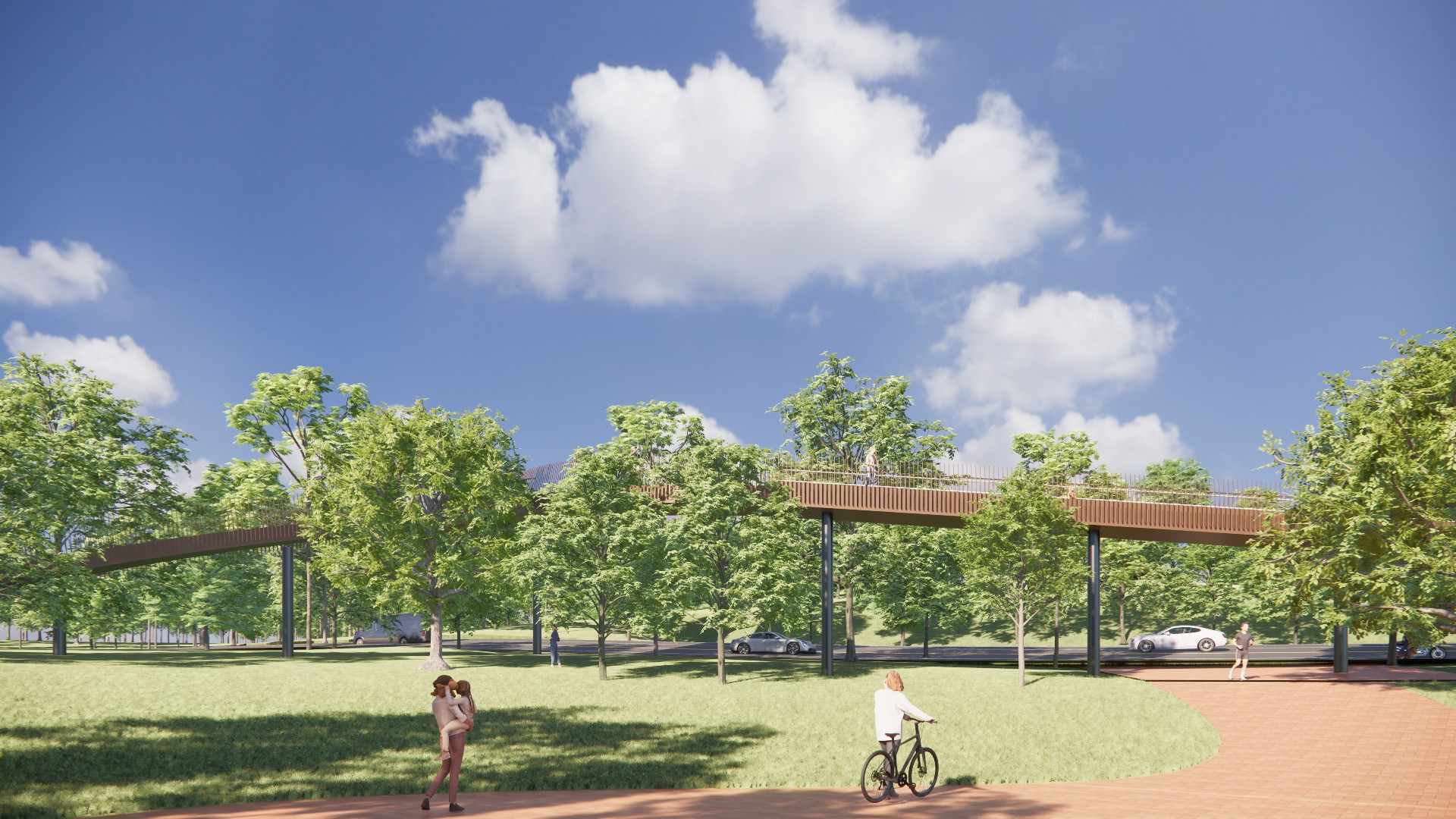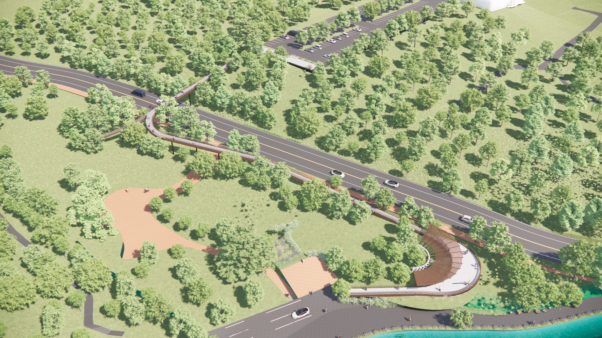 ↑圖說:「澄清湖跨越松藝路人行天橋」讓遊客能避開松藝路龐大車流,安全且順暢地往來兩園區。(圖片來源:模擬圖/高雄市工務局提供)