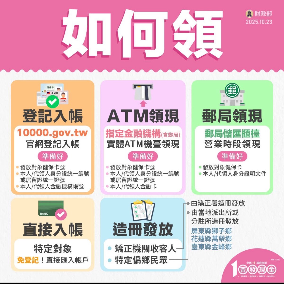 以下是「登記入帳」、「ATM領現」、「郵局領現」、「直接入帳」及「造冊發放」5種領取方式的重點整理