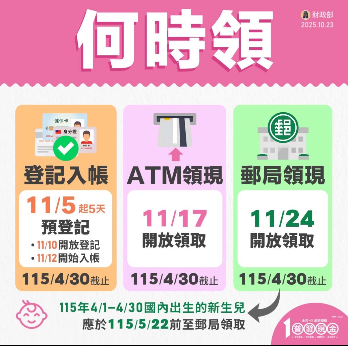 至於明年4月出生的新生兒,一樣可以領取,但要在明年5月22日至郵局領取。
