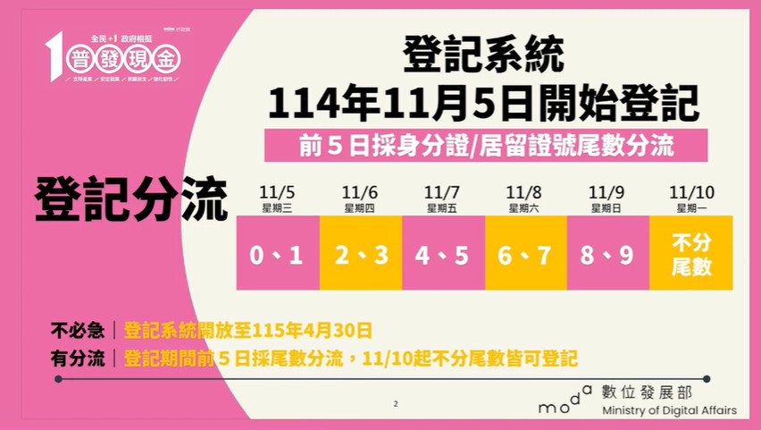 11月10日開始,則不限尾數,還沒登記的人,都可以上網登記,且截止日期是明(115)年4月30日。