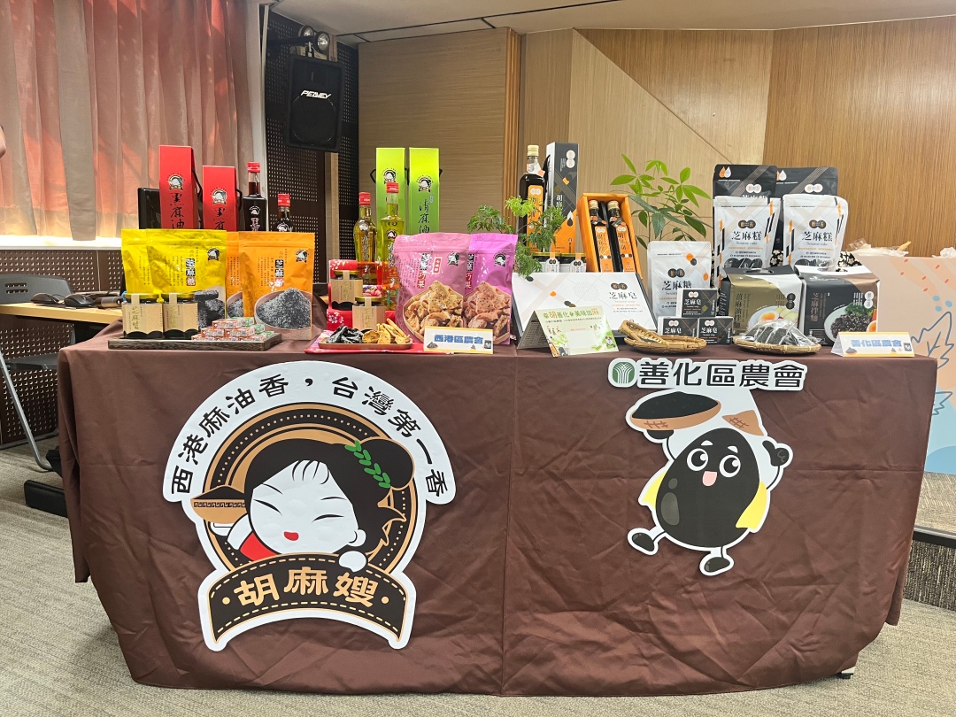 圖說:活動現場展出多款以臺南胡麻製作的在地特色產品,包含黑麻油、芝麻蛋捲、芝麻糖及創意料理包,呈現「西港麻油香、台灣第一香」的產地魅力。(圖片來源/台南農業局提供)