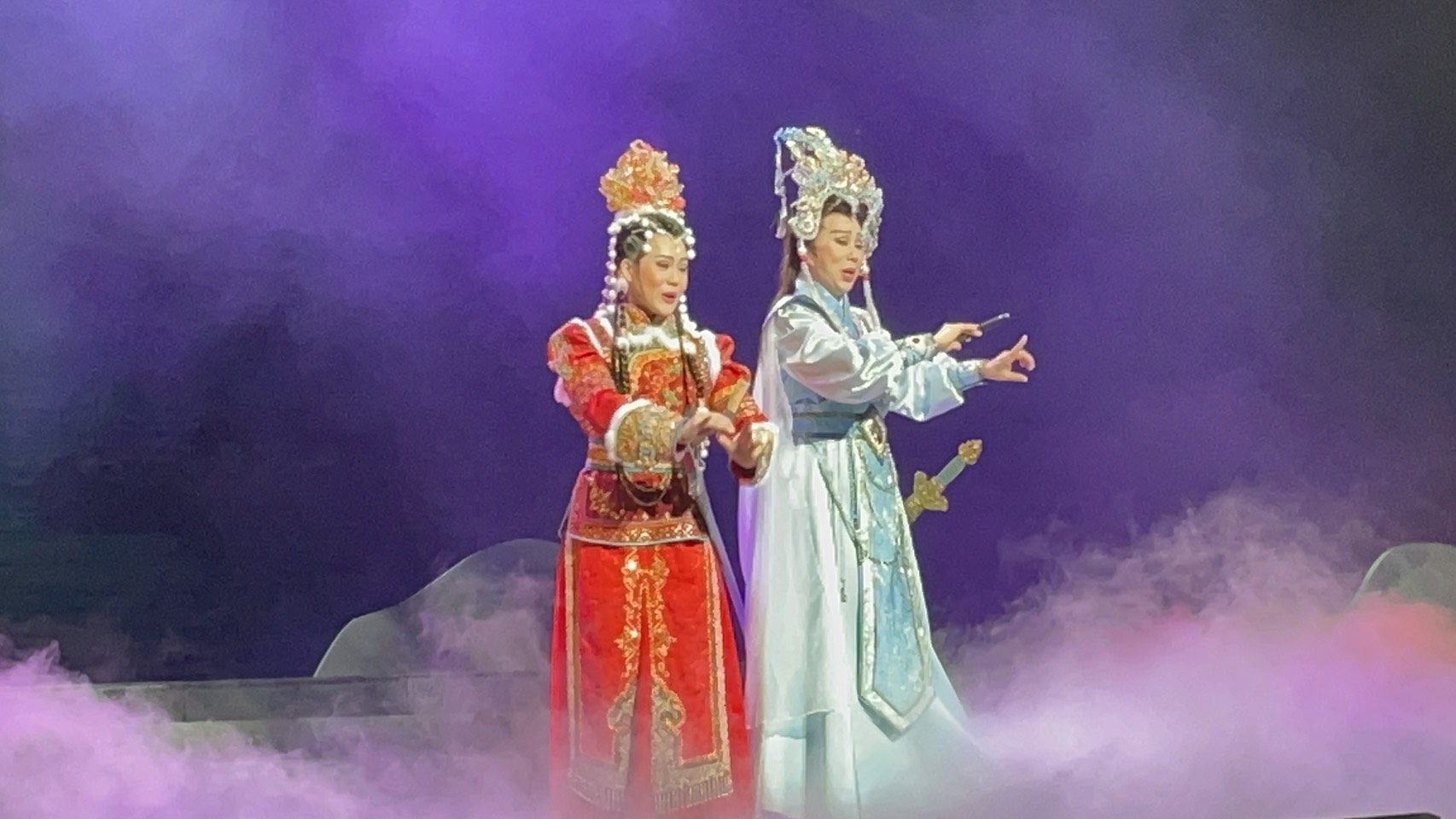 圖說:明華園總團「界牌關傳說」由國寶級台柱孫翠鳳(右)及陳昭婷(左)同台飆戲,以細膩唱念與身段詮釋跨越國仇的淒美愛情(圖片來源/記者林薇安攝)