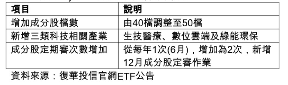 復華投信00929此次的3大變格,包括選股池從台灣上市櫃電子類股,放寬至台灣科技相關產業股票,使採樣母體擴增生技醫療、綠能環保及數位雲端等三類且非屬創新板之股票。