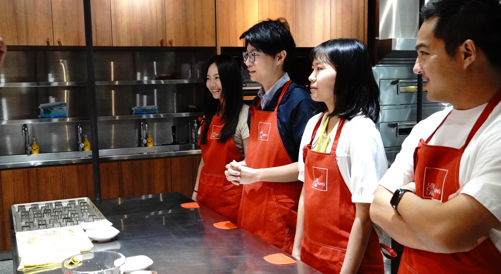 ↑圖說:林楷軒(右三)與實習生穿上紅色圍裙,於舊振南漢餅文化館裡學習漢餅製作工序,一窺爆紅鳳梨酥背後的迷人魅力。(圖片來源:高雄市青年局提供)