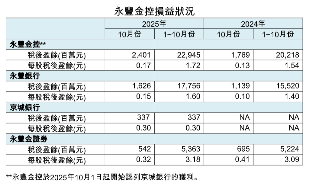 永豐金10月自結稅後盈餘24.01億元,累計前10月稅後盈餘229.45億元。值得一提的是,新加入的京城銀行,自10月起已經納入財報,100%反映,也為母公司永豐金貢獻稅後盈餘3.37億元。