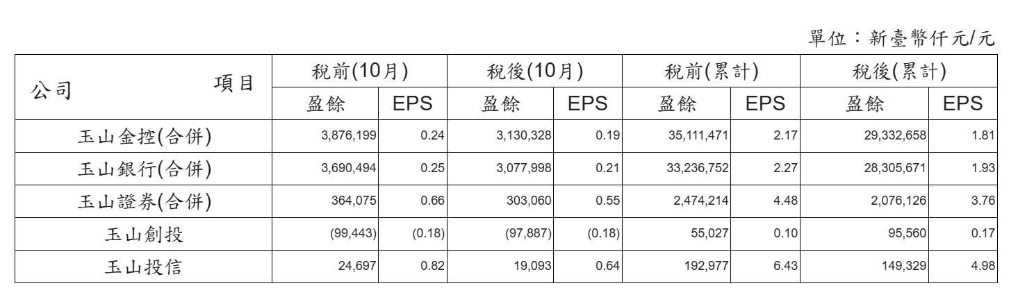 玉山金10月自結稅後盈餘31.3億元,累計前10月稅後盈餘293.3億元,創歷年同期獲利最高,年增30.98%, EPS為1.81元。
