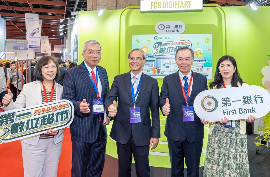 第一銀行以創新概念「第一數位超市(FCB DigiMart)」為主軸,將數位金融服務融入日常生活場景,帶來兼具生活感、信任感與科技感的沉浸式體驗,四大展區吸引民眾熱情參與,財政部政務次長阮清華(如下圖中,一銀提供)也親臨展區,由第一金控總經理方螢基(如下圖右二)引導參觀。