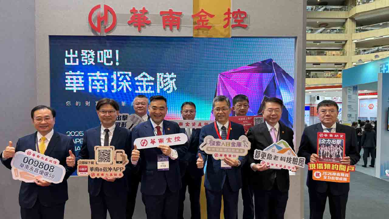 華南金總經理李耀卿(如下圖前排右三,記者李錦奇攝影)、華南金副董林知延(如下圖前排左三)、華南永昌證董事長黃進明(如下圖前排左二)等公司高層,今天也出席自家展場。