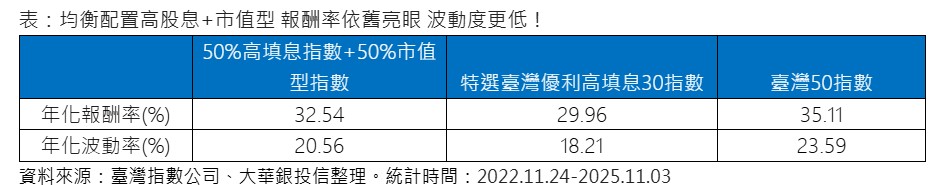 以今年績效居高息ETF前10強的(00918) 大華優利高填息30來說,追蹤的「特選臺灣優利高填息30指數」,若搭配最貼近台灣加權指數的「臺灣50指數」。根據回測結果顯示,若以50/50配置,近3年年化報酬率高達32.5%,顯示投資組合在報酬表現上,不僅不遜於單壓市值型ETF,波動度更是明顯下降,有助投資人兼顧息收與穩定。