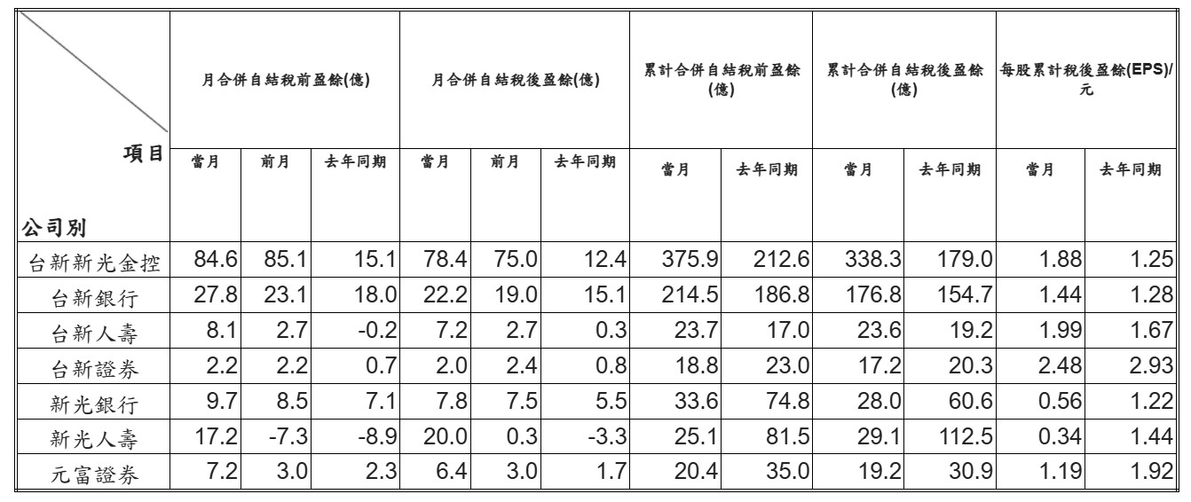 台新新光金重申,依國際財務報導準則第3號(IFRS 3,企業合併)規定,於合併時須對原新光金控各子公司部分資產負債之公允價值重新衡量,並以此作為金控合併時之新金控帳面價值以進行後續會計處理,與原新光金控各子公司個體財務報表之帳面基礎不同,此企業合併會計處理之相關影響數係反映於金控層級之自結損益。