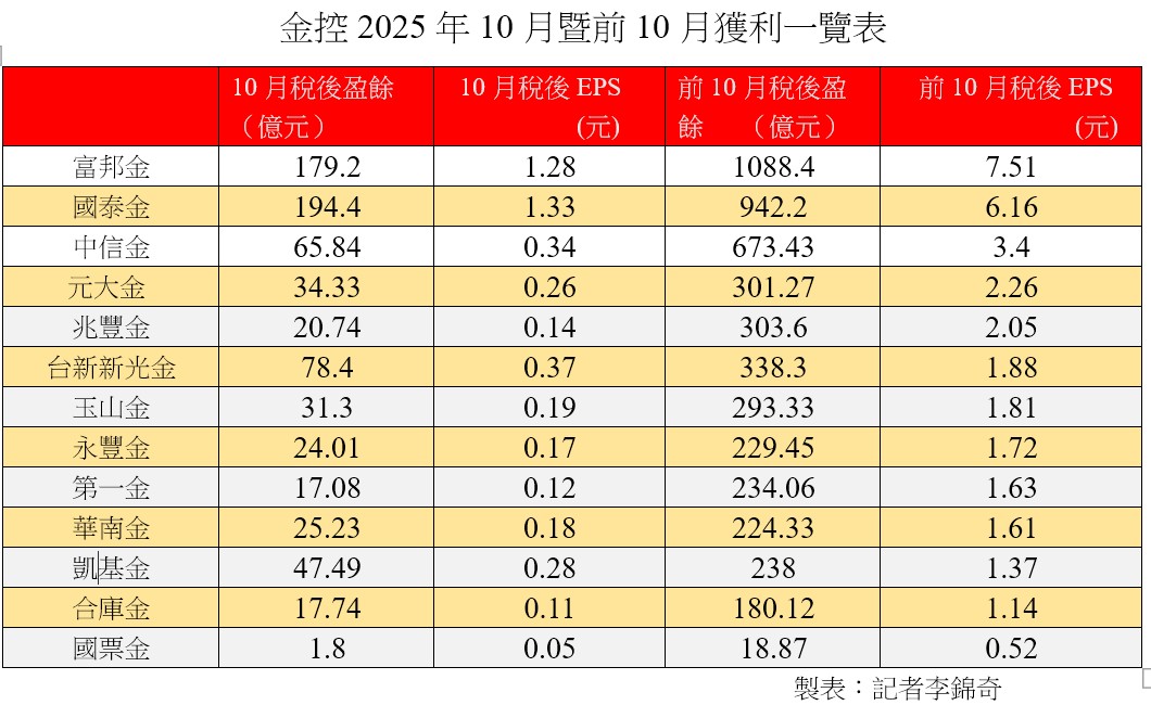 富邦金前10月EPS達7.51元居冠!國泰金6.16元居次 金控獲利一表掌握