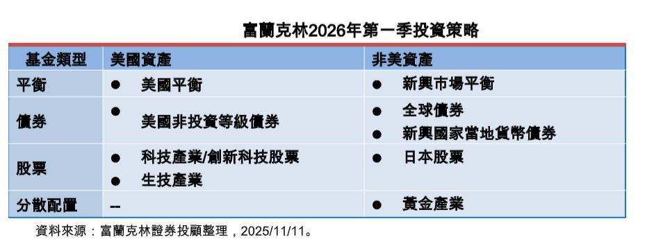 展望2026年第一季,富蘭克林證券投顧表示,預期在美中貿易情勢改善、美國大而美法案嘉惠美國經濟、AI投資及消費動能支撐下,全球景氣將穩健增長,加上聯準會偏寬鬆的政策基調,有利全球風險性資產多頭續航,重要消息面須關注AI投資續航力、聯準會新任主席人選和獨立性、中國三月兩會、美國與各國的貿易協議框架執行狀況等。