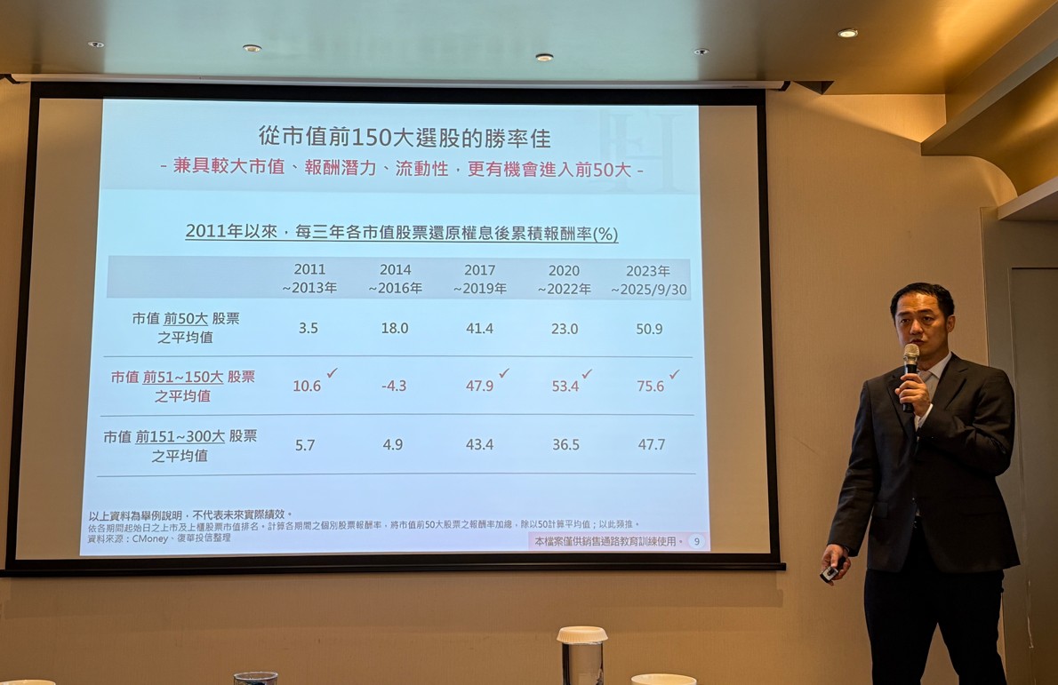 觀察自2011年以來,每3年各市值股票還原權息後累積報酬率顯示,市值前150大股票報酬平均值多高於市值前300大及前50大;若進一步從前51~150大股票選股,報酬率平均值亦多優於其他兩者,其中,2023年至今累積平均報酬率達75.6%,優於前50大、前151~300大的50.9%、47.7%。(如下圖,記者李錦奇攝影)