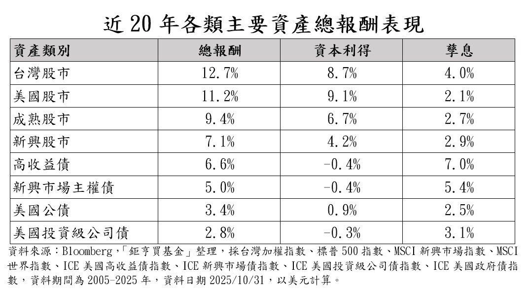 根據彭博資訊回測資料顯示,過去20年全球股市的總報酬率(即資本利得及孳息總和),台股達12.7%、美股11.2%、環球股市9.4%,均明顯優於各類債券約2.8%至6.6%。