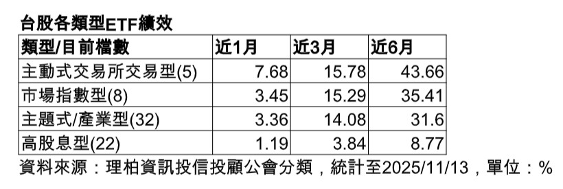 台股近月受AI雜音等變數干擾,回測月線支撐,進一步觀察台股各類ETF表現,主動式台股ETF近1月報酬逾7%表現相對突出。