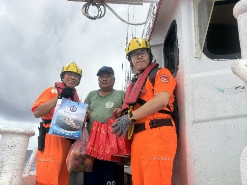 ↑圖說:「巡護八號」船登檢並發送慰問品予我國籍漁船(圖片來源:海洋委員會提供)