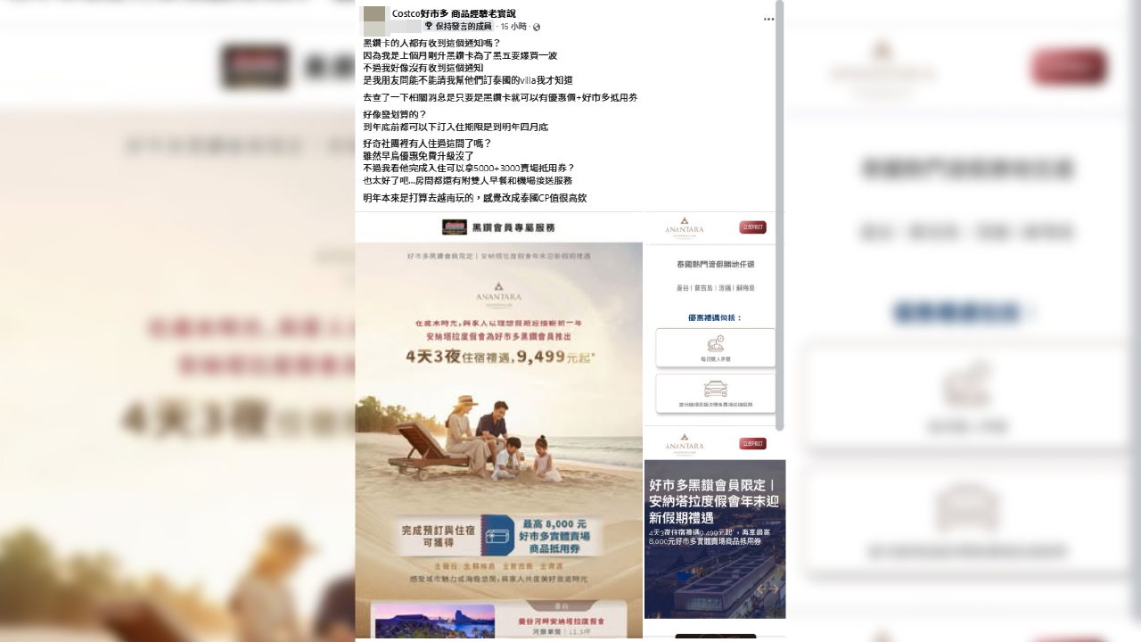 好市多近期與泰國安納塔拉度假會(Anantara Vacation Club)攜手合作,推出黑鑽卡會員專屬的豪華Villa住宿優惠方案,在臉書社團「Costco好市多 商品經驗老實說」引發熱烈討論,不少會員看到優惠內容後直接改變原訂的旅遊計畫。