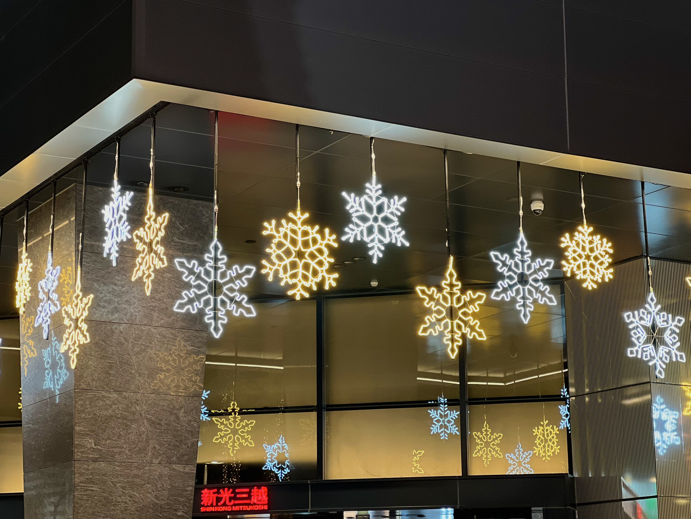 圖說:新光三越小北門外牆以金白色雪花燈飾營造冬季氛圍,為耶誕暖心列車主題點亮溫馨節慶光景。(圖片來源/新光小北門提供)