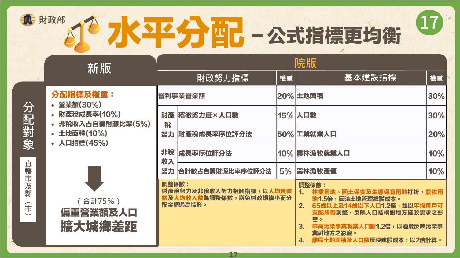 此外,行政院版本增加6%「農林漁牧產值」指標,以兼顧國土計畫與糧食安全;「土地面積」指標權重也從立院版本的10%提升至18%,並按照土地使用分區調整,更貼近實際治理需求。人口結構部分,包含年齡層及產業人口分布,也同步納入,以呈現不同縣市的社會負擔差異。