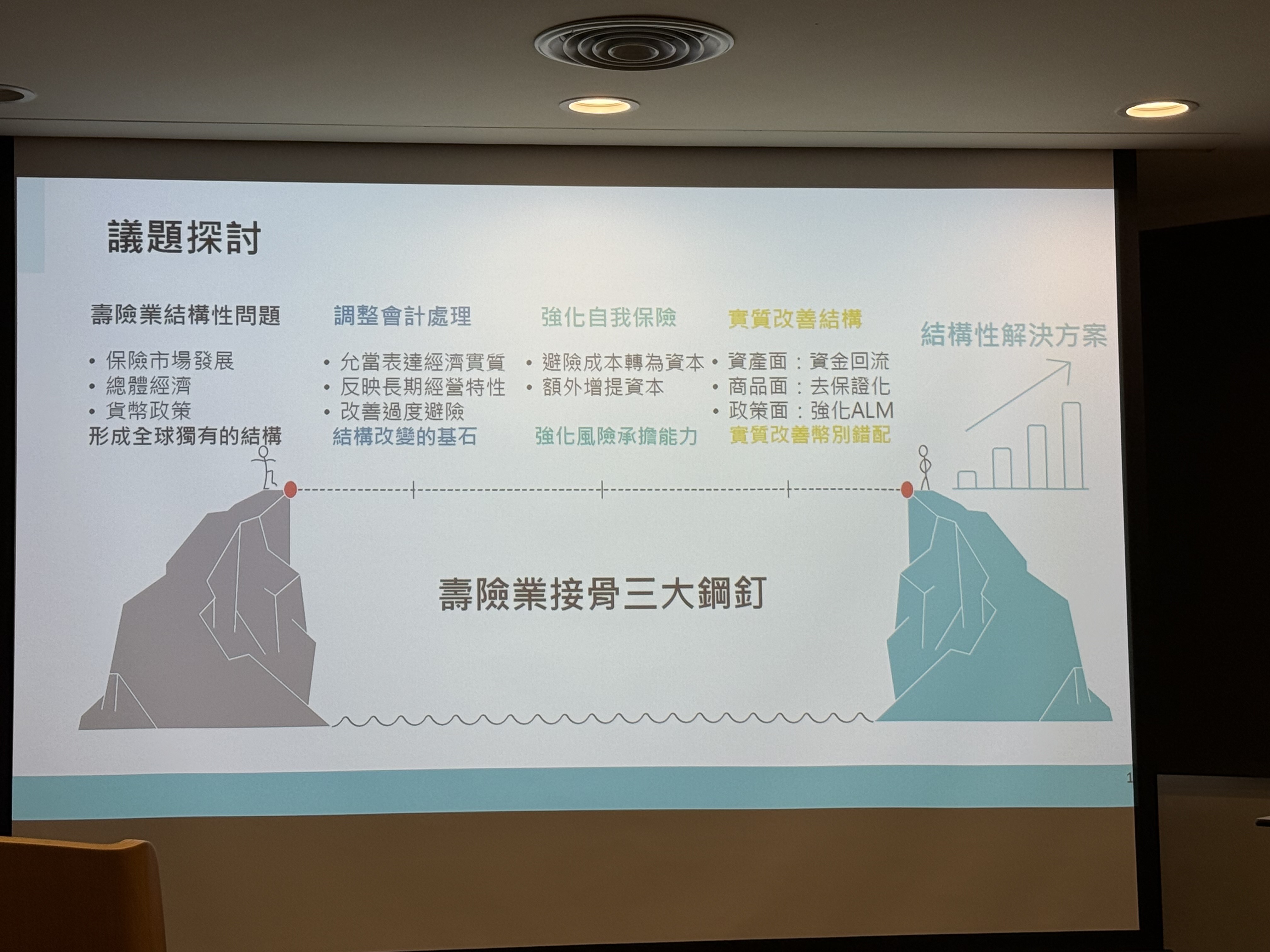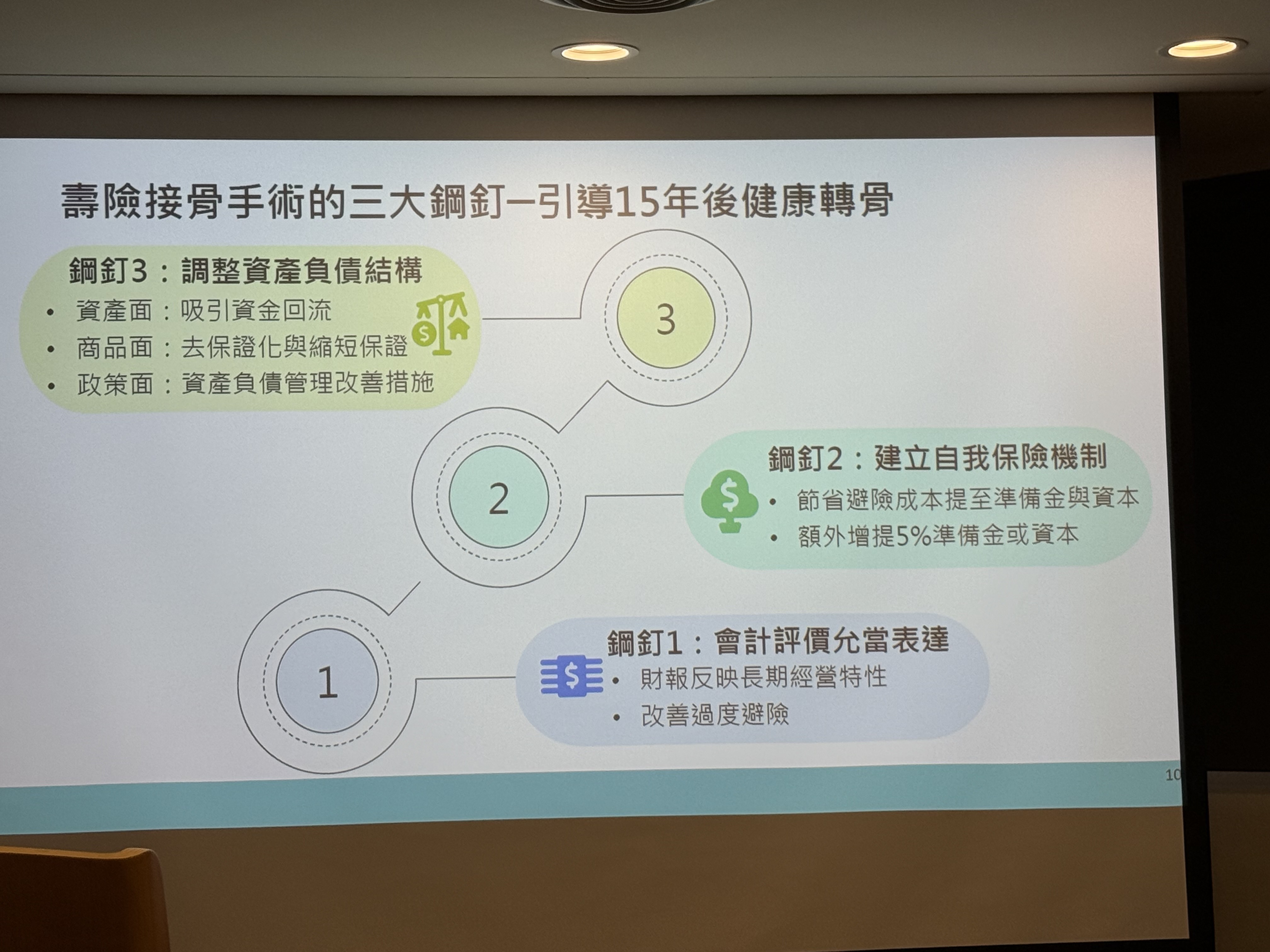 這些改革本質上需較長的時間推動,所以需要同時打下三根鋼釘,第一根鋼釘是降低會計制度造成的避險壓力,節省不必要的短期避險成本,再結合第二根鋼釘支撐,能快速累積的自我保險資本,第三根鋼釘就是調結構,接骨及長骨需要體力與時間,因此,唯有厚植壽險業財務實力,才能有足夠的空間與時間去支應相關的調整。