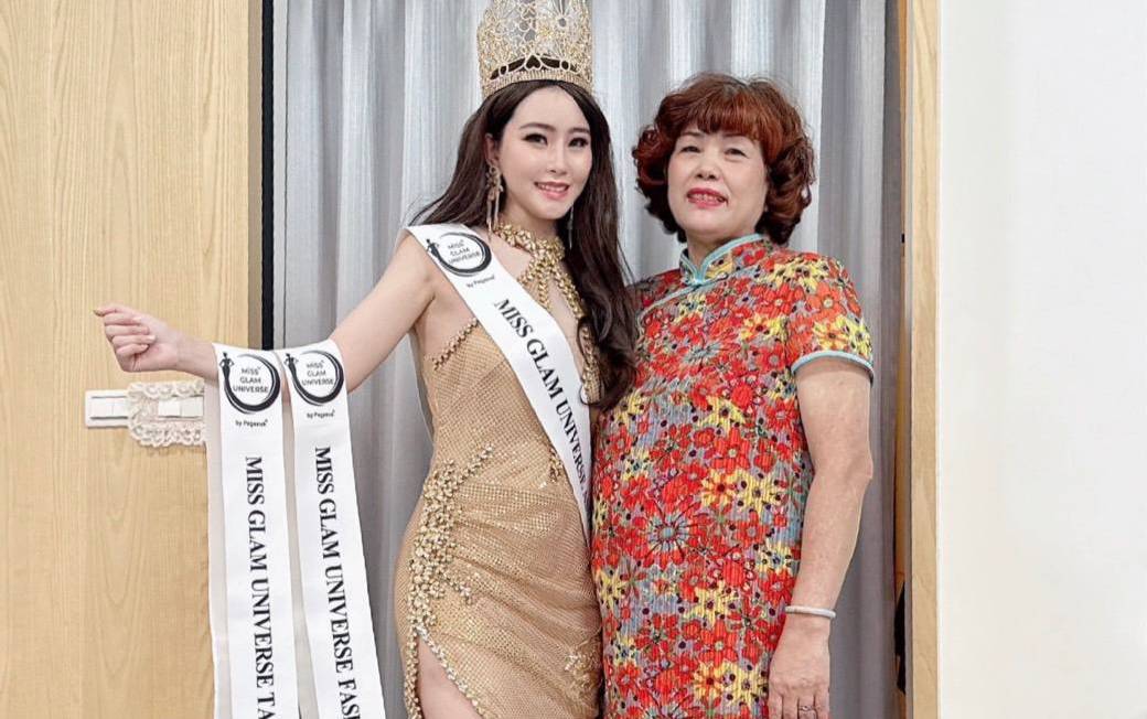 圖說:鄭珊汶(右)穿著改良式旗袍結合鳳冠打造的國服,與業界譽為「冠軍製造機」的許米蓁合影。(圖片來源:鄭珊汶提供)