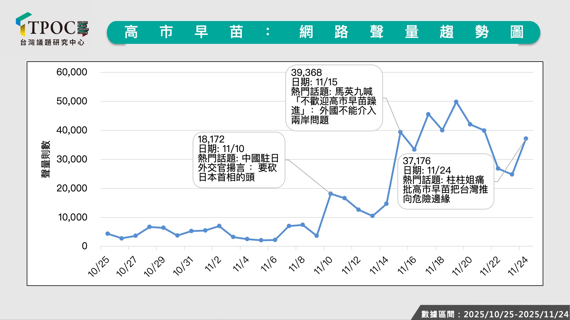 TPOC台灣議題研究中心透過QuickseeK快析輿情資料庫,觀察10月25日至11月24日間網路輿情對於「高市早苗」的相關討論。根據數據分析,調查期間內平均每日聲量約落在1.6萬則左右,但在中國駐大阪總領事薛劍11月8日透過社群平台開嗆「斬斷骯髒頭顱」前,單日聲量都不超過7400則,直到8日當天聲量一舉飆高至超過1.8萬則,之後平均每天討論度都超過3萬則。整體而言,調查期間內的聲量最高峰出現在11月18日日中磋商當天,日本外務省亞洲大洋洲局長金井正彰、中國外交部亞洲司司長劉勁松兩人互動的畫面,被網友解讀「中國人斜眼看人、日本人抿嘴低頭」,引發不少延伸討論,單日聲量逾4.9萬則。