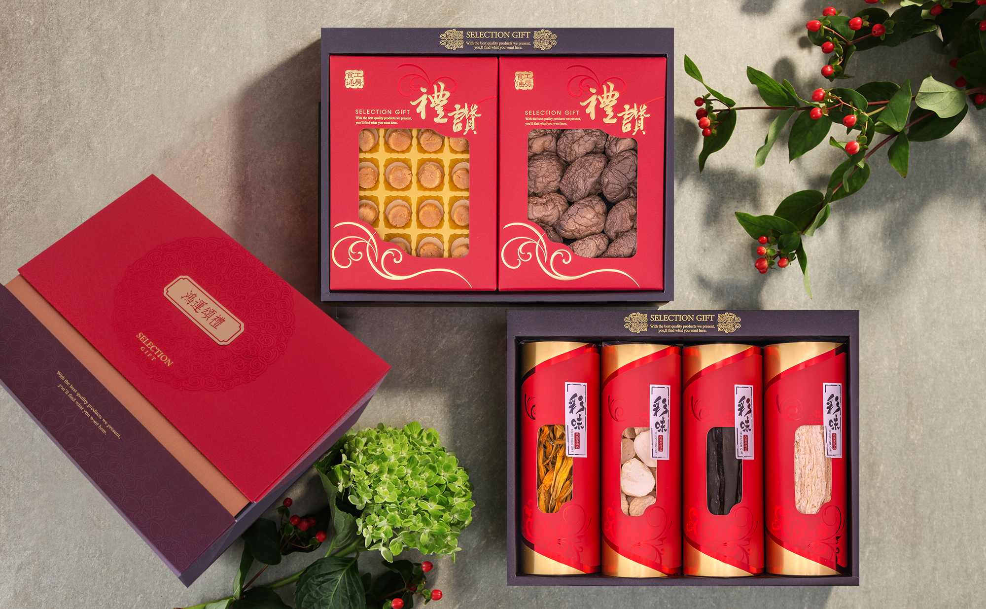 「鴻運頌禮禮盒」(2180元/盒),嚴選6款經典頂級乾貨珍味,匯聚日本北海道干貝、台灣香菇、太麻里金針、新社杏鮑菇、北海道昆布,以及極為珍稀的「竹笙」等食材。(如下圖,大盛屋提供)