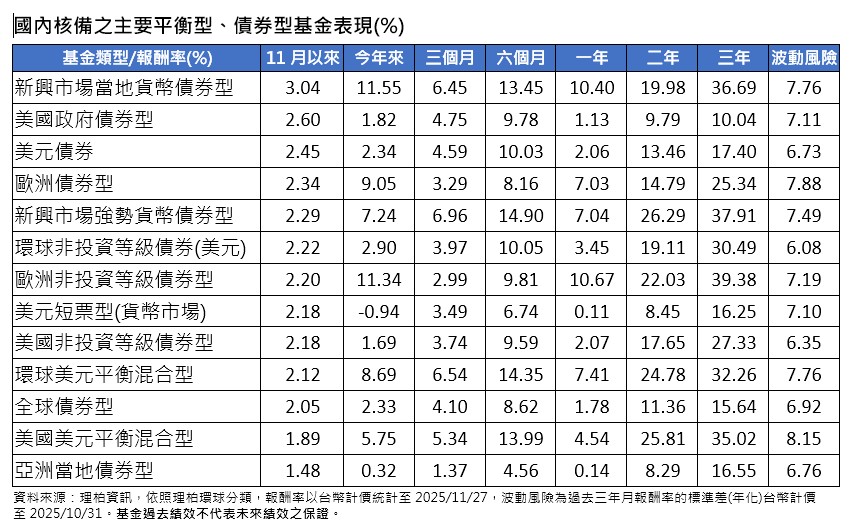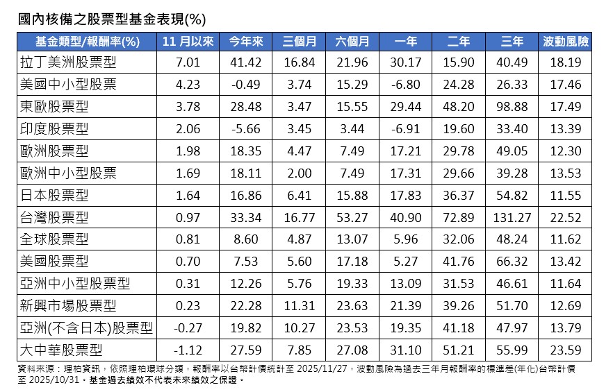 至於主要區域股票型基金,大中華、亞洲(不函日本)股票型基金,11月平均都是虧損,表現居後,主要是受到AI概念股休息拖累,反觀科技色彩較少的如拉丁美洲股票型基金,平均上漲7.01%居前,主要也反應高利率的巴西未來降息題材;美國中小型股和東歐股票型基金亦各有4.23%和3.78%漲幅。