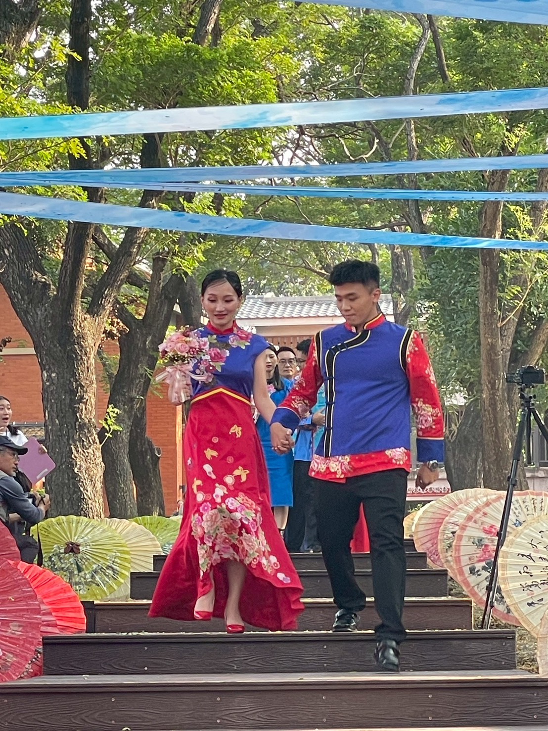 高市府客委會主委楊瑞霞則說現場之所以感到「熱」,不是因為天氣,而是新人與來賓的熱情感染了每一個人。今年特別以雨豆樹步道為紅毯,讓新人在綠蔭與祝福中亮相,並以步道兩旁的油紙傘,寓意圓圓滿滿及期待新人同心協力為家人撐起幸福的未來,提醒新人要互相尊重、互相扶持,並祝福大家多子多福、早生貴子。高雄客家婚禮舉辦已 12 年,共見證逾四百對新人,她也期盼未來能「一起回娘家」,讓更多家庭參與這份幸福。