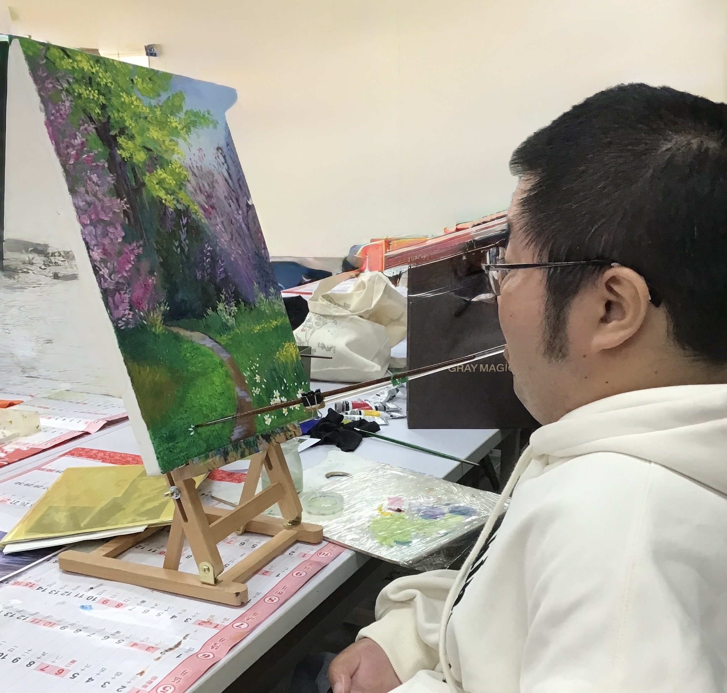 五彩繽紛的花朵在藍天白雲下絢麗綻放,色彩層次細膩、充滿生命厚度,這幅畫作出自44歲的SMA病友沈永德。自罹病之後,他的肌肉力量逐日流失,目前僅剩頭部仍能活動;他靠口咬著畫筆,一筆一筆描繪心中嚮往的歐洲藍天花海。