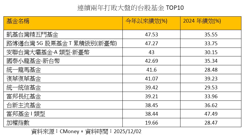 這6檔連2年勝過台股的基金,包括凱基台灣精五門基金、路博邁台灣5G股票基金T累積級別(新臺幣)、安聯台灣大壩基金-A類型-新臺幣、國泰小龍基金-新台幣、統一龍馬基金、復華復華基金。