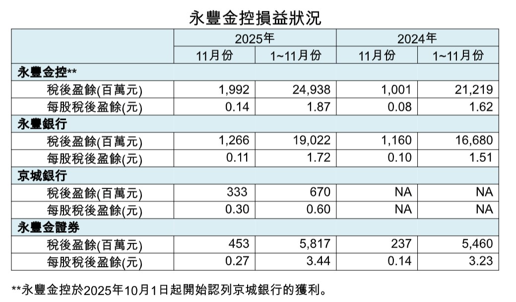 主要子公司永豐銀行11月稅後盈餘12.66億元,累計前11月稅後盈餘190.22億元;京城銀行11月稅後盈餘3.33億元,累計前11月稅後盈餘6.7億元;永豐金證券11月稅後盈餘4.53億元,累計前11月稅後盈餘58.17億元。