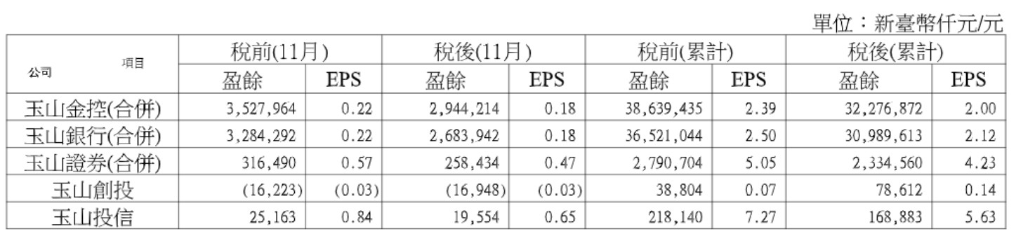 主要子公司玉山銀行累計前11月稅後盈餘309.9億元,年增36.6%;