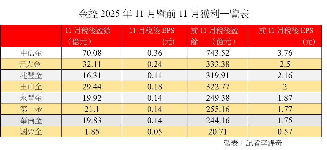 金控11月暨前11月自結獲利陸續出爐,其中,中信金前11月自結稅後盈餘743.52億元,續創歷年同期新高,每股稅後盈餘(EPS)來到3.76元;同樣續創歷史新高的還有玉山金、永豐金、第一金、華南金。