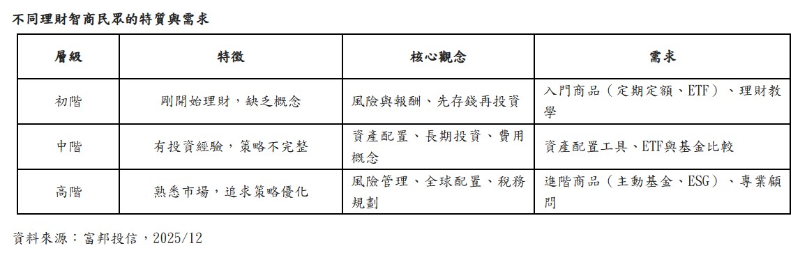 富邦投信表示,今年推出的「理財智商系列影片」會依照民眾理財智商不同程度量身設計。初階族群以建立正確理財觀念與風險認知為重點;中階族群協助強化資產配置能力,理解不同市場周期能靈活調整策略;高階族群因多具市場經驗,影片將著重在投資策略優化與進階分析。