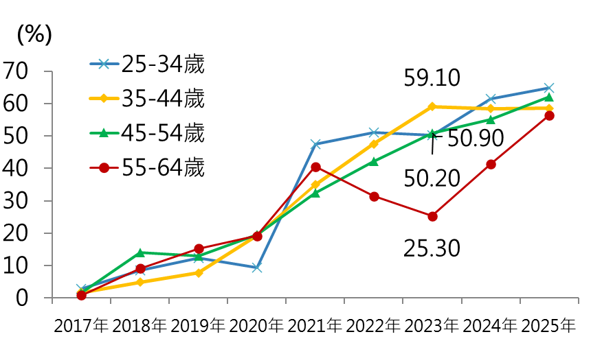 今年調查亦持續觀察民眾的ETF投資行為,結果顯示ETF已成為不同年齡層的重要理財工具。未退休族群的 ETF使用率,自2017年的1.96%大幅躍升至2025年的59.9%;已退休族群也從1.44%成長至40.6%,顯示ETF以其透明、低成本、易操作等特性,已成為退休財務穩健配置的主流選擇。尤其年輕族群對ETF的接受度更是明顯提高,已將其視為理財組合的核心配置。