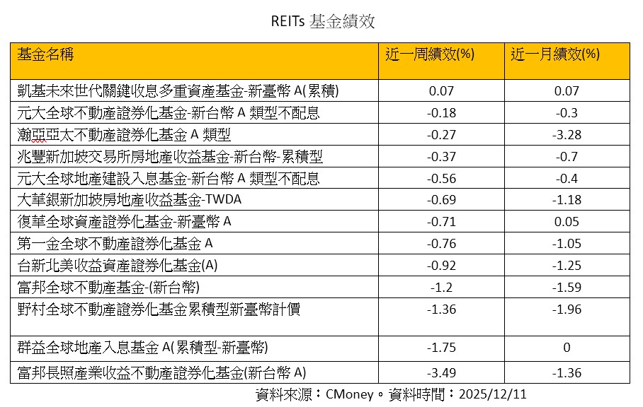 觀察市場13檔含REITs基金近一周績效,只有凱基未來世代關鍵收息多重資產基金-新臺幣A(累積)繳出正報酬。